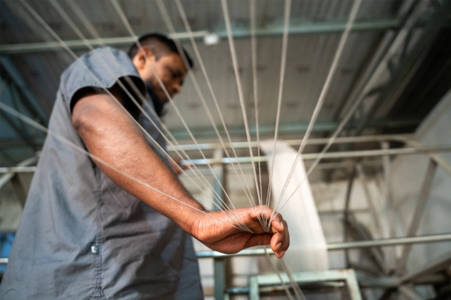 Bangladesh offers something increasingly rare in global sourcing: depth. The textile heritage runs deep here, from hand-woven cotton and jute to the distinctive rush and grass fibres that define regional craft - waterhyacinth, hogla (a grass), murta (a rush). Many of these natural fibres are blended and spun into yarn for textile production. These materials, combined with the country's established fashion manufacturing infrastructure, create an unusual advantage: access to both virgin materials and reclaimed materials, including pre- and post-consumer waste streams ready for use in circular production.