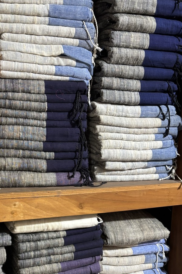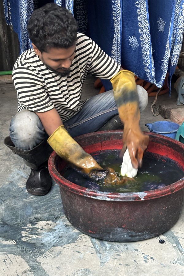 De ambachtelijke technieken zijn net zo divers. Handweven, borduren, quilten, naaien, zeefdrukken - dit zijn vaardigheden die verankerd zijn in gemeenschappen door het hele land. Verfprocessen variëren van industriële operaties met synthetische kleurstoffen tot kleine, met de hand geverfde batches waarbij makers gespecialiseerd zijn in shibori, batik of ikat. Bangladesh heeft ook een rijk palet aan natuurlijke verftinten. Indigo springt er in het bijzonder uit, wordt lokaal geteeld, is verankerd in de cultuur en staat centraal voor de textielidentiteit van het land.